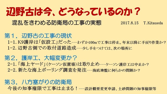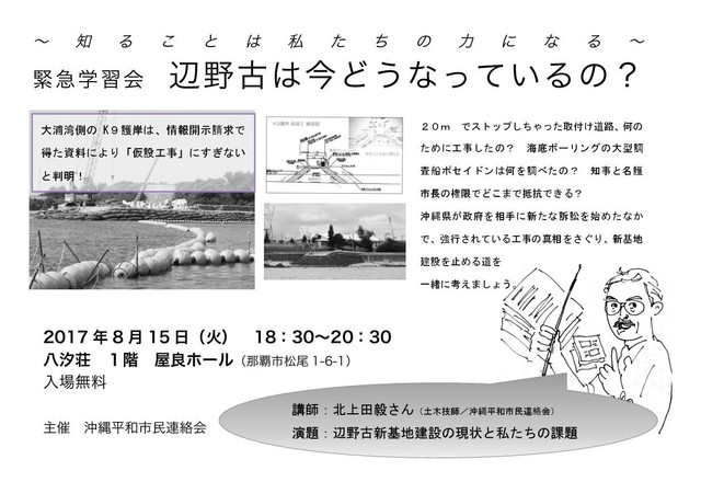 翁長知事は、昨日の県民大会でも改めて埋め立て承認の「撤回」を力強く宣言しました。知事を支えるためにも、辺野古現場での行動強化が大切になってきます。現在の辺野古の工事の実態とその問題点について、正しく正確に把握し、共に頑張りましょう。