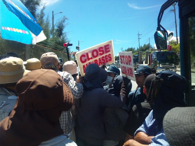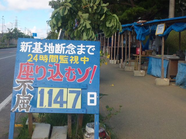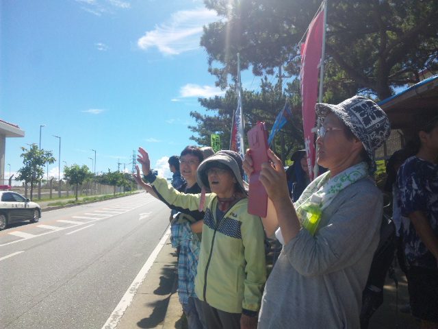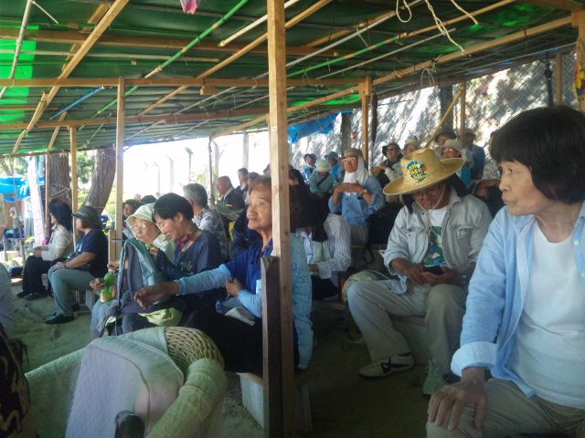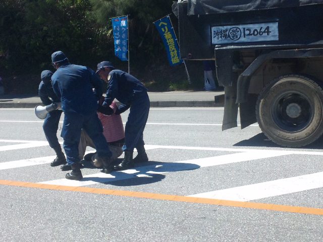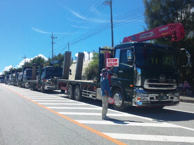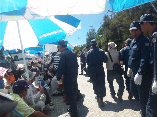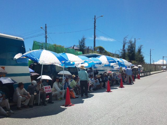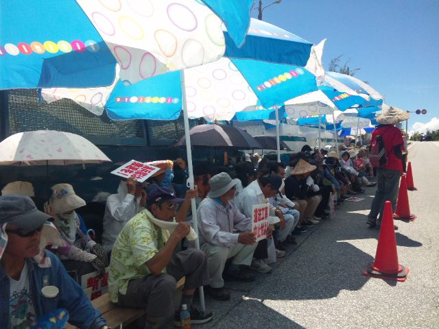 あまりに熱いので、10時過ぎにはメインゲート前のテント下に移動して集会を継続。これまで午前中に人が集中して、午後に少なくなる傾向があったため、各島ぐるみのバスが時間差で到着するよう調整、午後もかなりの人が座り込んだ。トラックの移動が始まったとの報告で、再び工事用ゲートに集まったが、2時前に機動隊の強制排除にあい、重機やコンクリートブロックを積んだトラック十数台が基地の中へ。
