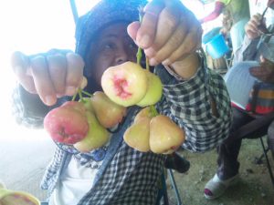 今日も差し入れがいっぱい。バナナ、グアバ、レンブ、どれも暑さを癒す南国の果物たち。
