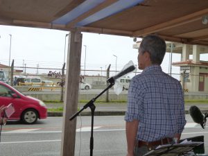 辺野古ゲート前で基地に向かって訴えているのは、自らをガマフヤーと称し、ボランティアで34年間も戦没者の遺骨を掘り続けている具志堅隆松さん(63歳)。