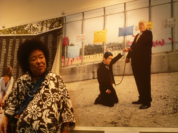 パートⅣとなる今回の大琉球絵巻。第四部の大きなポイントの一つはは、辺野古新基地をめぐってトランプ大統領と安倍総理の関係。「お手」と差し出したトランプ大統領の手のひらに、ポチよろしく「お手」をする安倍総理の図。しっかり首輪もはめられている。