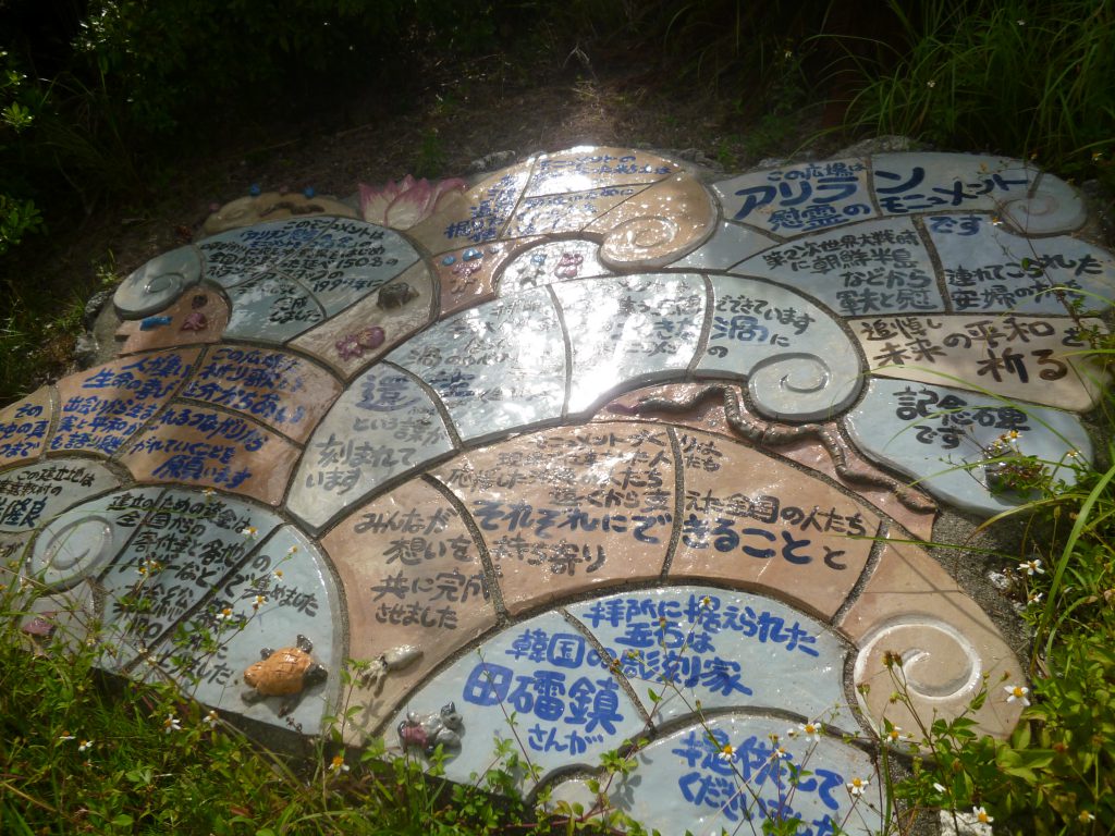 モニュメントの碑は、「環生」・命の循環をテーマに沖縄の石材と島の土で焼いた陶板でデザインされていますが、碑の真ん中にある濃いグリーンの「玉」だけは韓国から運ばれたものだそうです。そしてその「玉」を通して見る海の向こうが朝鮮半島の方角です。