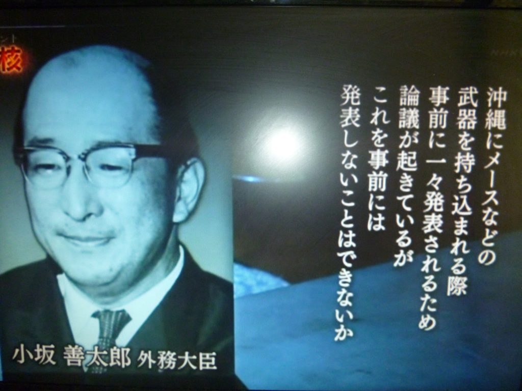 佐藤内閣当時の外務大臣・小坂善太郎とラスク米国務長官とのやりとり。小坂:「沖縄にメースなどの兵器を持ち込むとき、事前に発表しないで」ラスク:「手続き上何らかの発表はしなければならない」 小坂:「事後ならいい」。オスプレイ配備のときと全く同じ構図、いまに始まったことではない。「核持ち込みの事前協議」のまやかしが透けて見える。