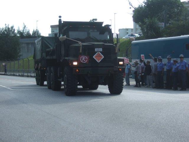 核兵器が隠されていた弾薬庫の一つ“辺野古弾薬庫”の入り口キャンプ・シュワブ第2ゲート。毎日ここから「火薬」のマークをつけたトラックが、何の規制もなく県道へと出入りする。今もここに核兵器があるとの噂が絶えない。