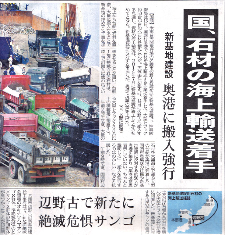 昨年の高江の工事では、民間や自衛隊ヘリによる空からの資材搬入を行ったが、辺野古では海からの搬入である。なりふり構わぬ権力の無法、違法極まりない横暴に、県民の怒りは高まるばかりである。
