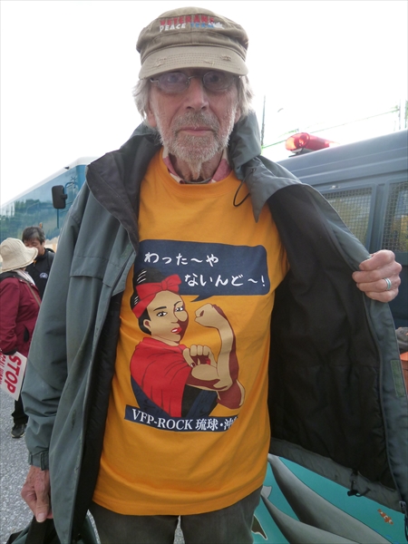 VFP沖縄支部の代表・ダグラス・スミスさん。独自のTシャツを作成して「辺野古NO!」をアピール。