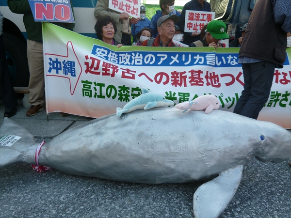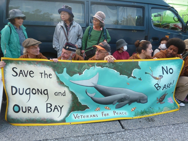 この日は、神奈川県平和委員会のメンバー25人も、辺野古の闘いのシンボル・ジュゴンのオブジェと一緒に座り込んだ。不屈の座り込み1256日目の辺野古ゲート前から。