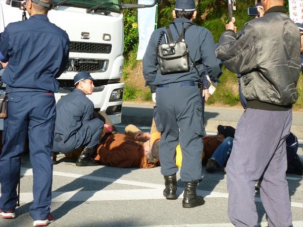 機動隊の檻に囲われても、抵抗を続けるVFPのメンバー。機動隊の隙を見て、6~7名が一斉に柵を飛び越えて、工事車両のダンプの下に潜り込んだ。