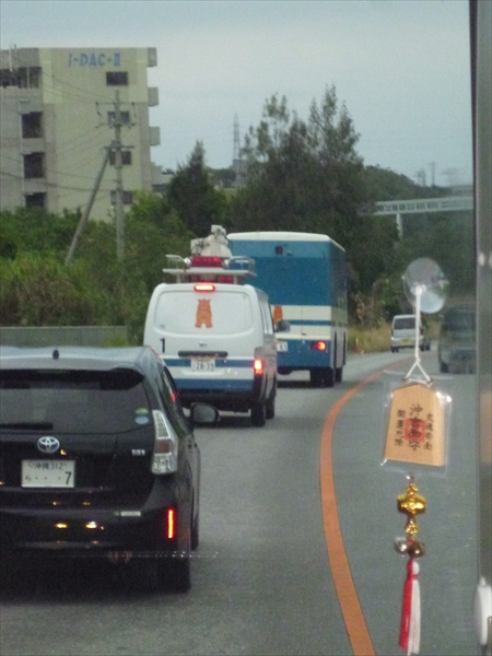 さらに辺野古の少し手前で、私たちのバスの前を機動隊を乗せた装甲車が行く。今日は早めに入りそうだとイヤな予感がした。
