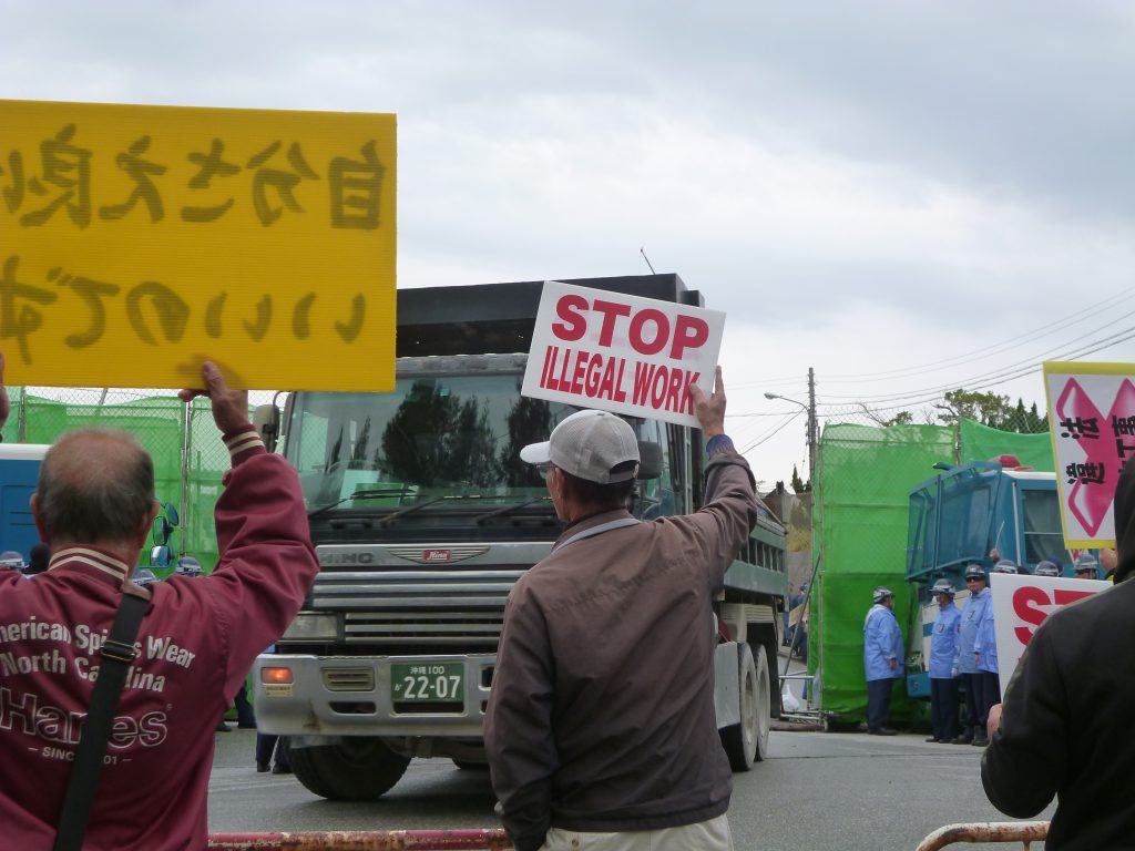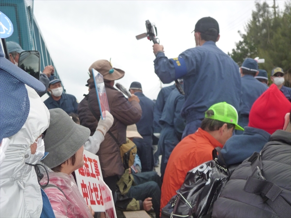 結局、夕方4時までの間に合計3回の排除で258台(ダンプ198台、ミキサー車29台、その他31台)に入られてしまった。正午から山城博治さんらの裁判の最終弁論の日と重なり、抗議の人たちが分散されてしまい、人数がいつもより少なくなったところを狙われたかたちだ。