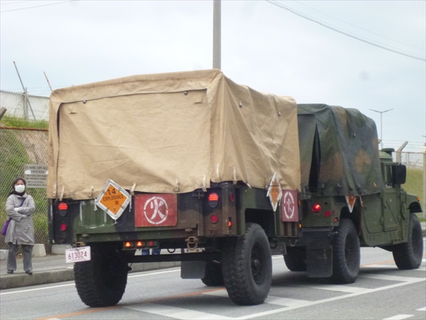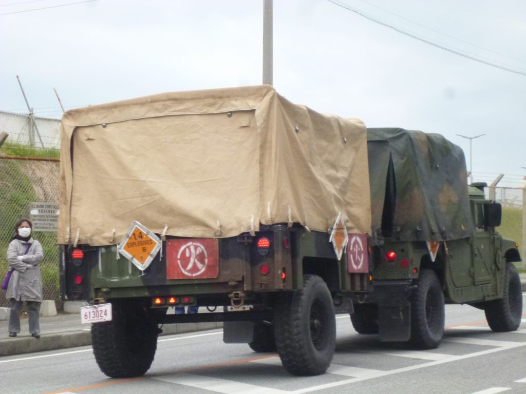 どこかで演習が行われているようで、辺野古弾薬庫から実弾を運ぶ車がしきりと行き来しているのが目に付いた。国道をこんな危険な車が、何気なく走っているのが沖縄の現実である。↓