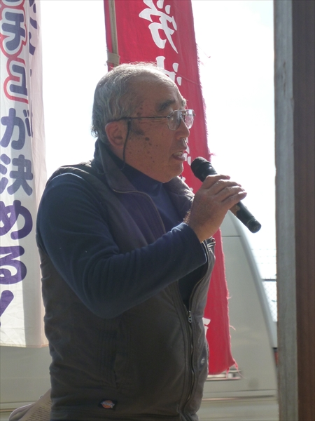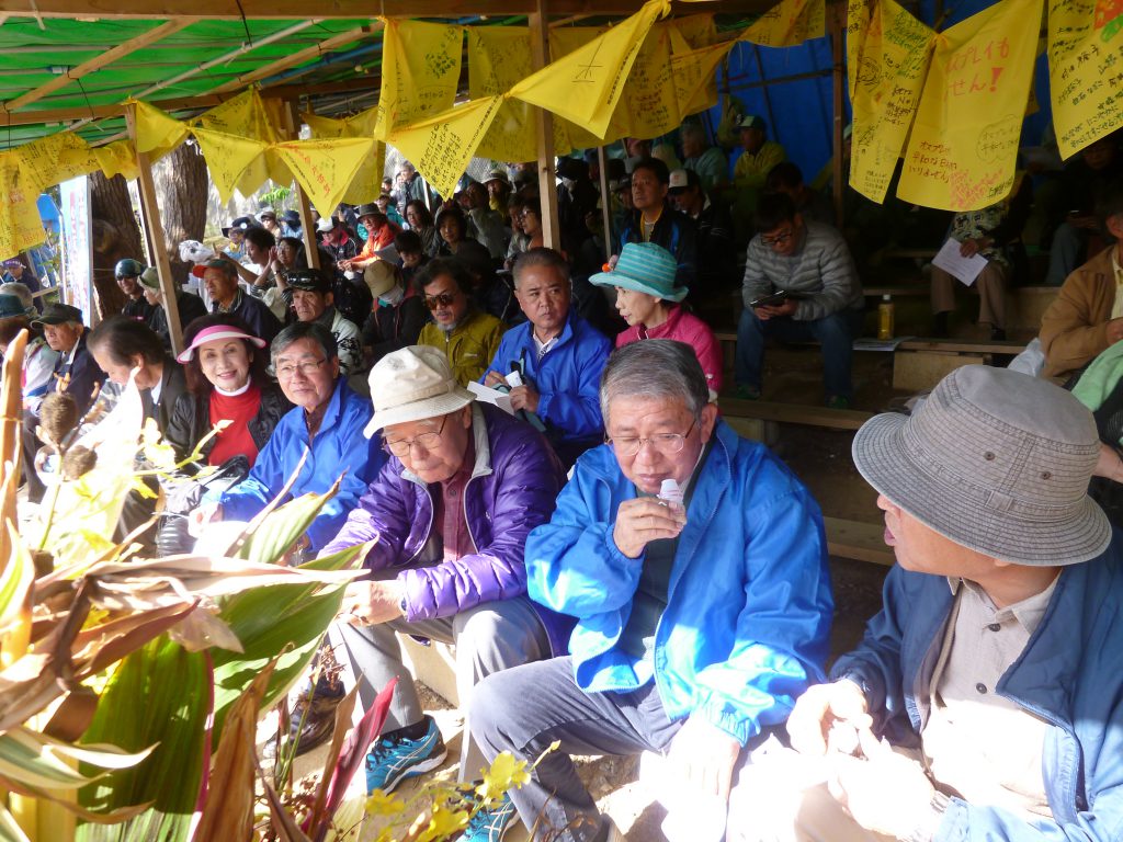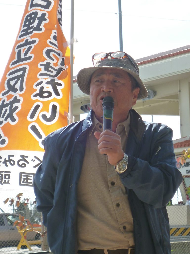 主催者挨拶はヘリ基地反対協の共同代表・安次富浩さん。「20年闘い続けて来れたのは、ここに座る皆さんの力あってこそ。感謝にたえない。この間に何人もの命を守る会のお年寄りたちや、仲間が、解決をみることなく他界された。天国で見守る彼らのためにも、あきらめることなく最後まで闘い続ける」と、改めて決意表明。
