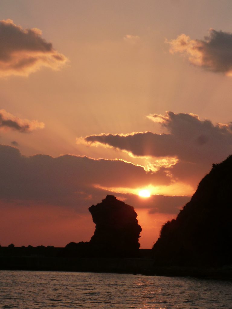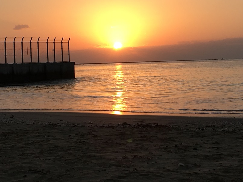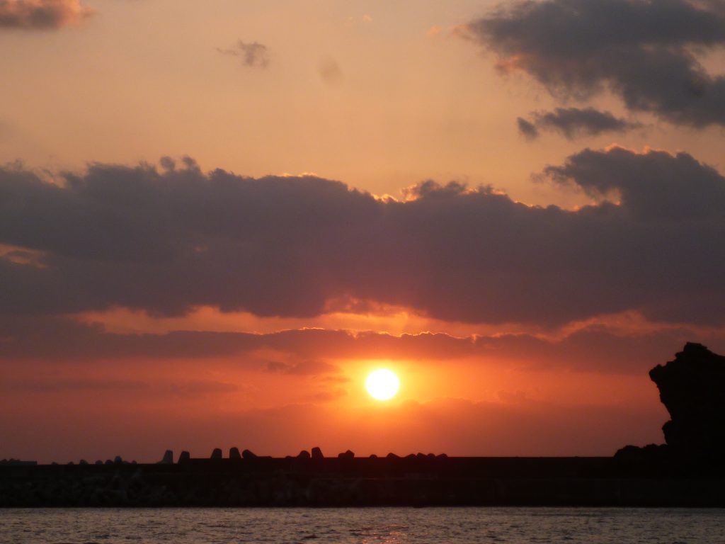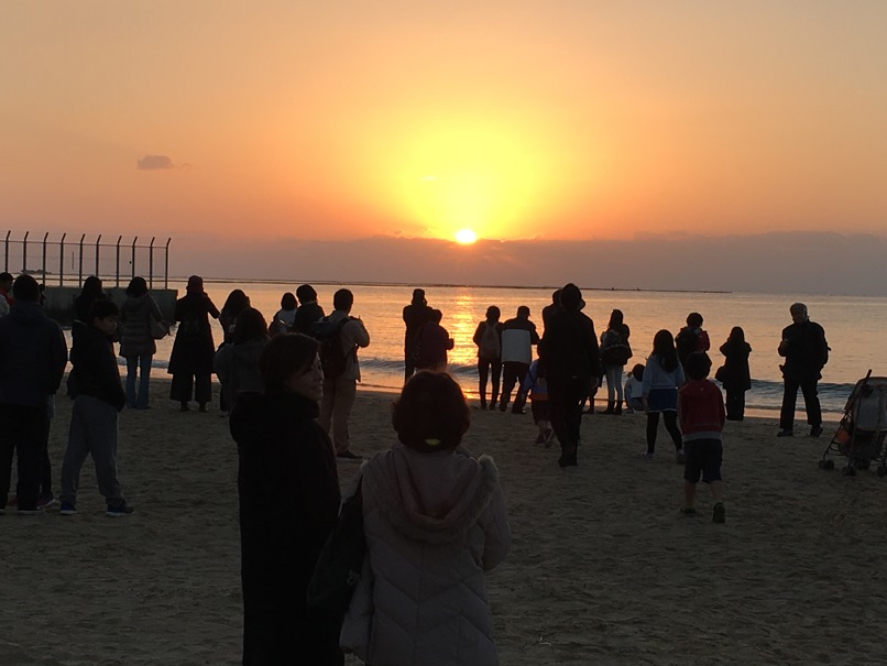 渡嘉敷島の初日の出です。天気予報は曇りで、果たして日の出が拝めるか心配しましたが、厚い雲の間から しっかり顔を覗かせてくれました。いいしょーがつで~びる!