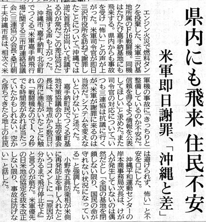 米軍と国の対応 この差は何? ~三沢事故と沖縄 青森県・三沢基地所属の米軍機・F16が訓練中にエンジンから火を噴き、緊急対応として小原川湖に燃料タンクを切り離し落下させた事故。米軍は即日三沢市役所に出向き謝罪、政府も同日素早い対応で「補償について話し合いたい」とコメントを発表したという。 沖縄で相次ぐ不時着や部品落下事故に、米軍は謝罪どころか沖縄県が事故状況の説明を求めても、いまだになしのつぶて。日本政府が沖縄を見下していることをよく知っている米軍は、しっかり右へ倣えしているようだ。 沖縄~平和のメッセージ 2018年2月23日unaiリンクURL この記事を共有する → Tweet Pin It