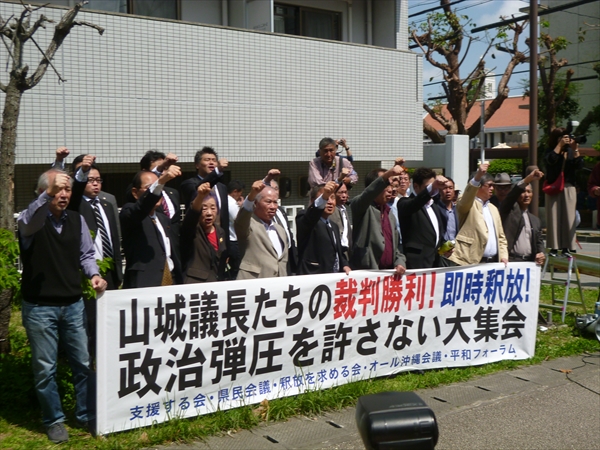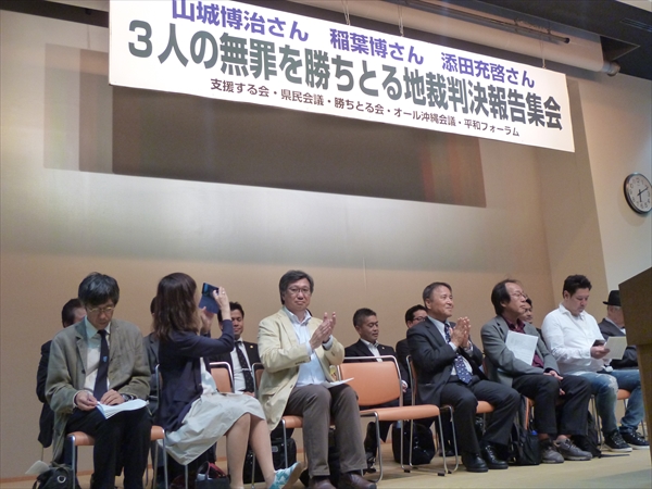 弁護団が「沖縄平和運動弾圧裁判」と名づけた辺野古や高江で抗議中に逮捕され裁判にかけられた山城博治さん、稲葉博さん、添田充啓さんの裁判、14日那覇地裁で判決が出された。