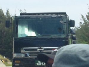 すでに工事資材を積んだトラックがゲート前の両側に100台近く並んでいた。先頭のトラックの運転手は待ちくたびれて新聞を広げて読み始めた。3時間を過ぎるころからは日よけを広げて眠ってしまった。