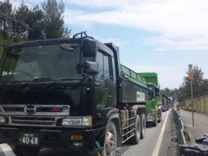この間国道を南下する車線は渋滞。工事トラックの間に挟まれた民間車両は交通警察官がいるにも関わらず誘導されることもなく、渋滞に巻き込まれたまま、何時間も留め置かれた。