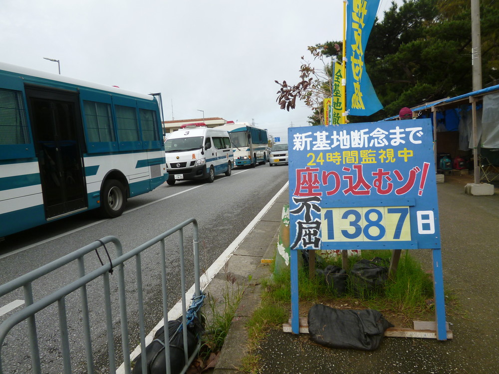 早朝6:30に那覇を出発。朝7:40ごろ辺野古に到着すると、テント前がいつもよりかなり賑やか。那覇をはじめ各地の島ぐるみや、平和市民団体がチャーターバスが次々やってきていた。