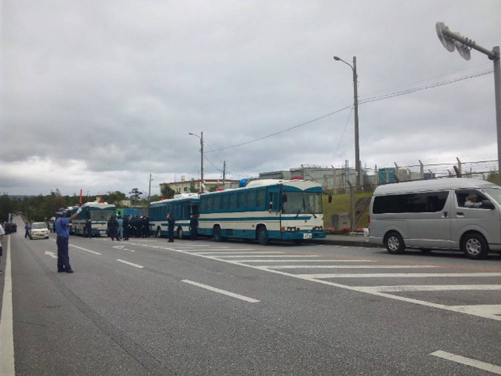 初日に5時間半もダンプを止められたことから、機動隊は2日目の昨日からは、抗議の座り込みができないよう大型の警察車両を道路にはみ出して駐車している。