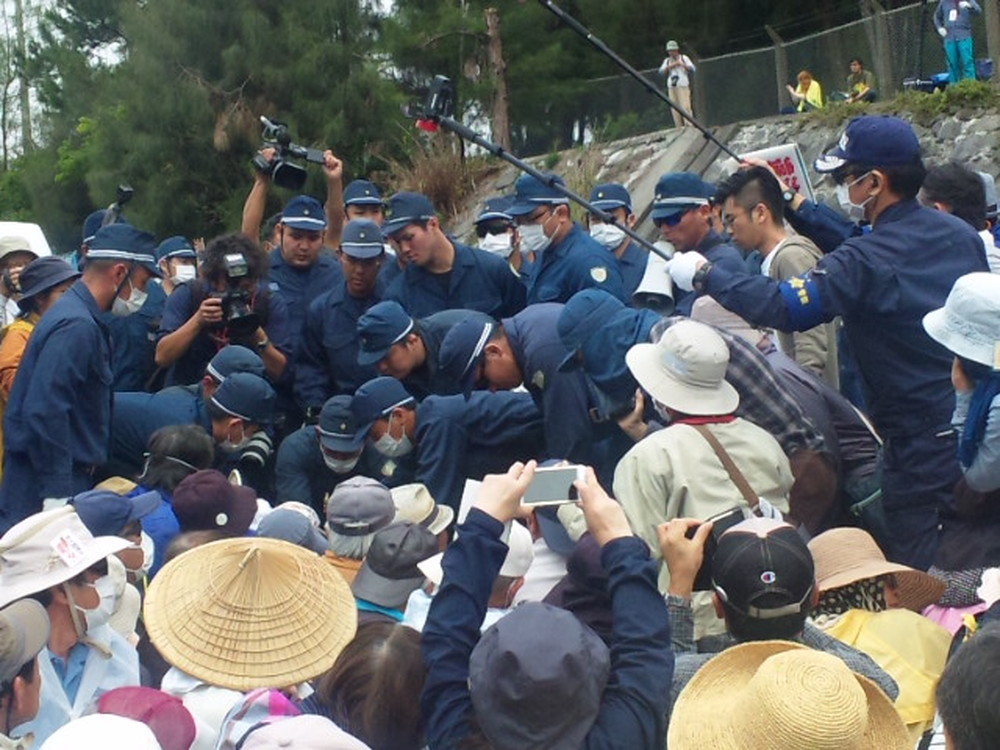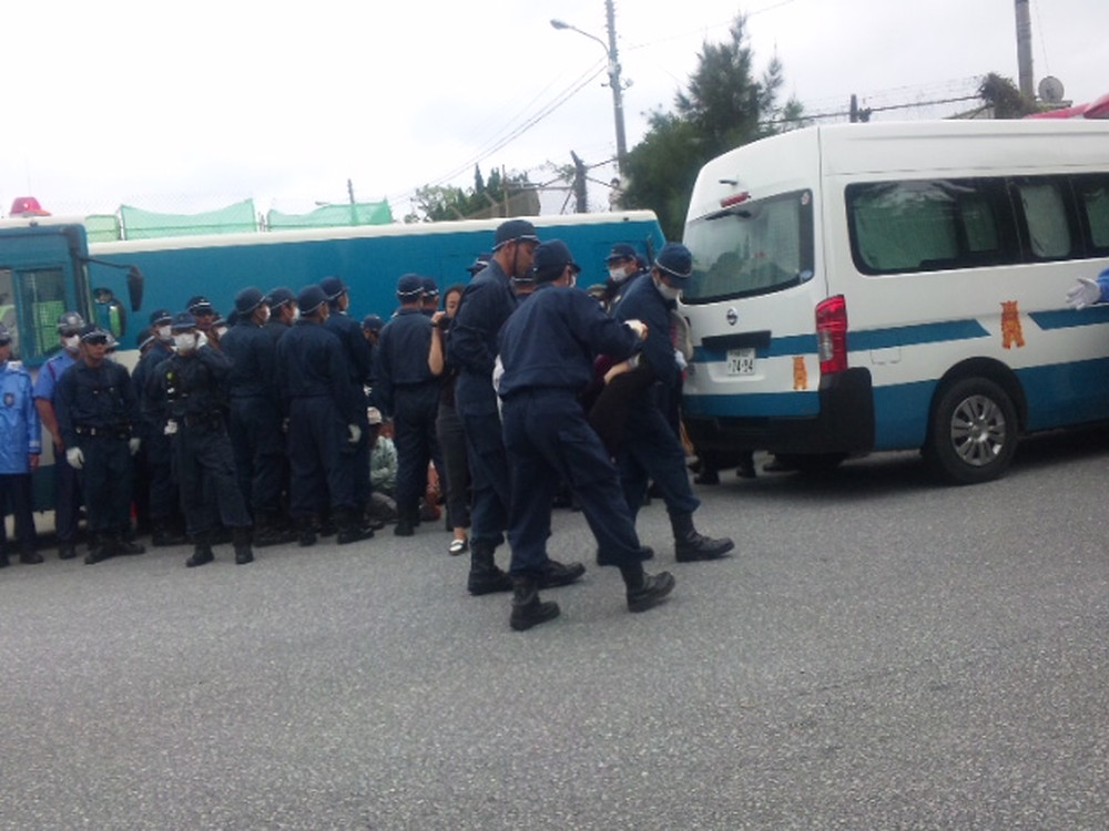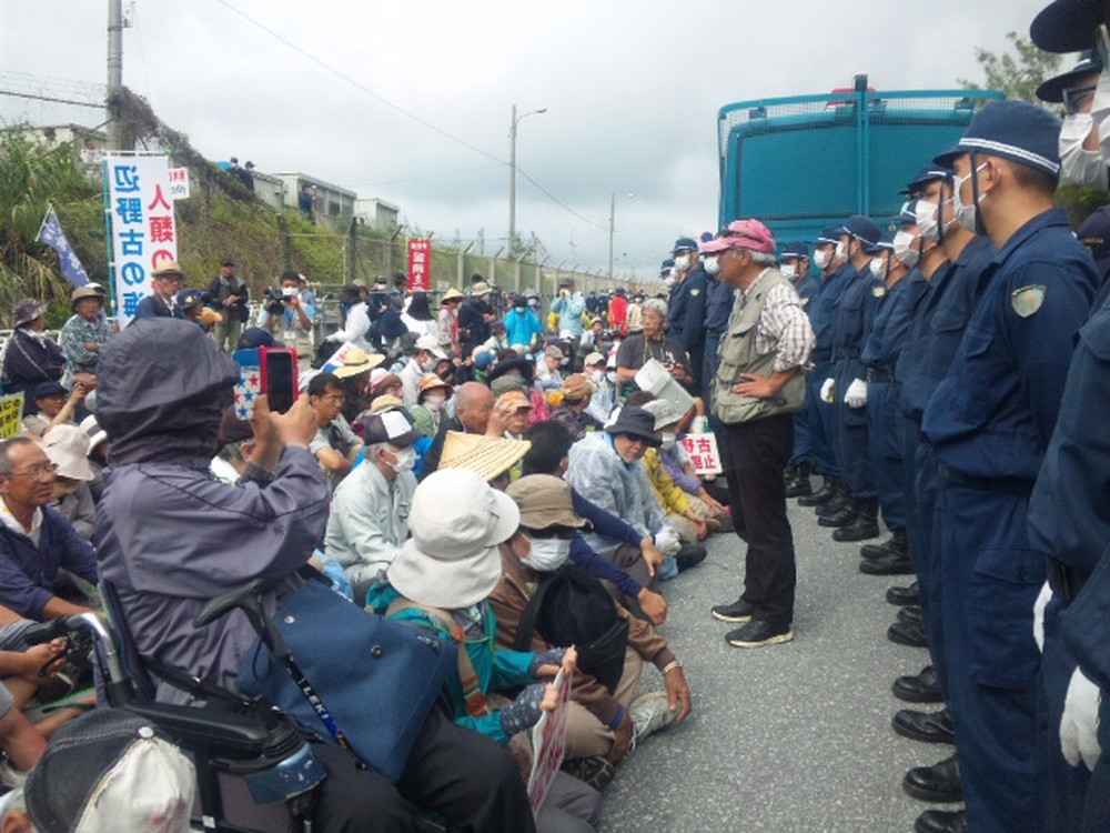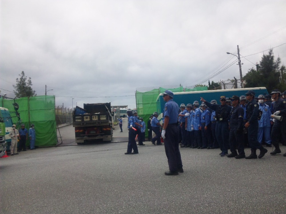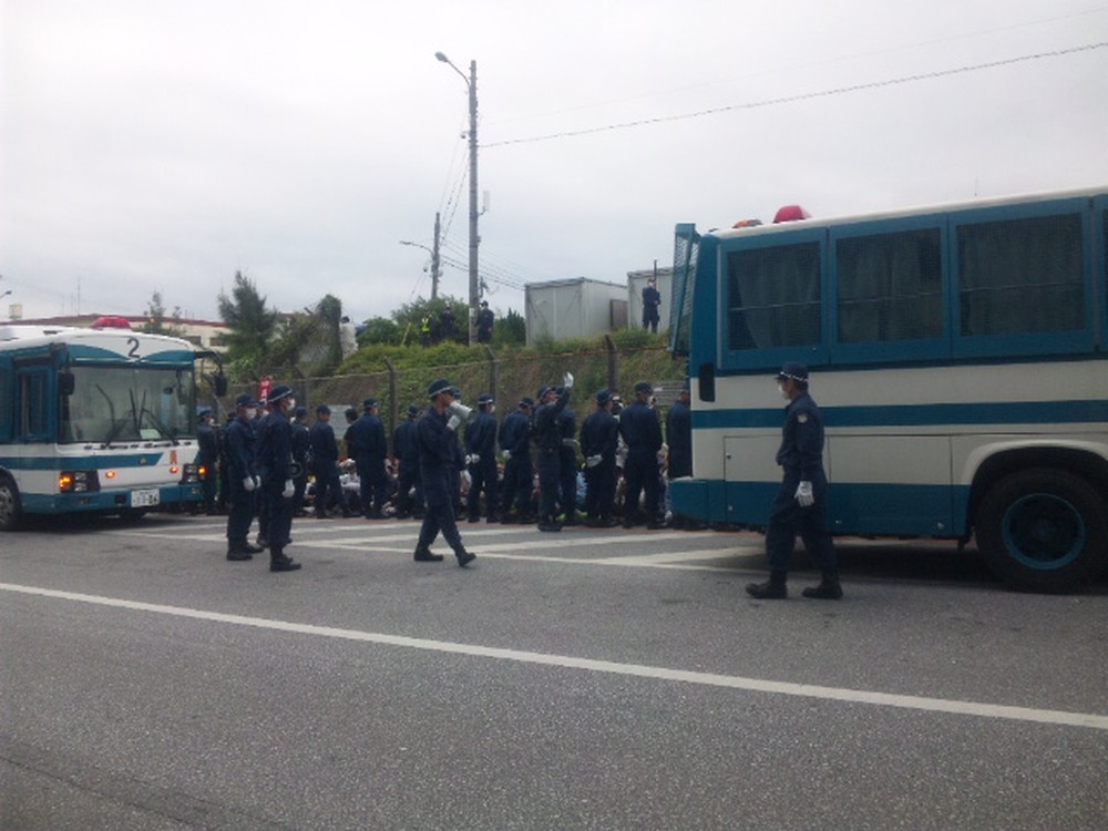 私たちが辺野古に到着した午前7:45にはすでに、ケート中央の警察車両の前には機動隊が、民間警備のアルソックと共に二重三重になって整列していた。