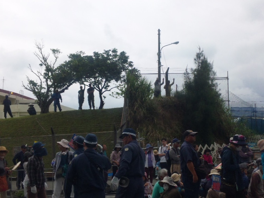 基地の中から、米兵と工事関係者とみられる人たちが高見の見物。時折抗議の人たちを指さして笑い合っているのがなんとも腹立たしい。