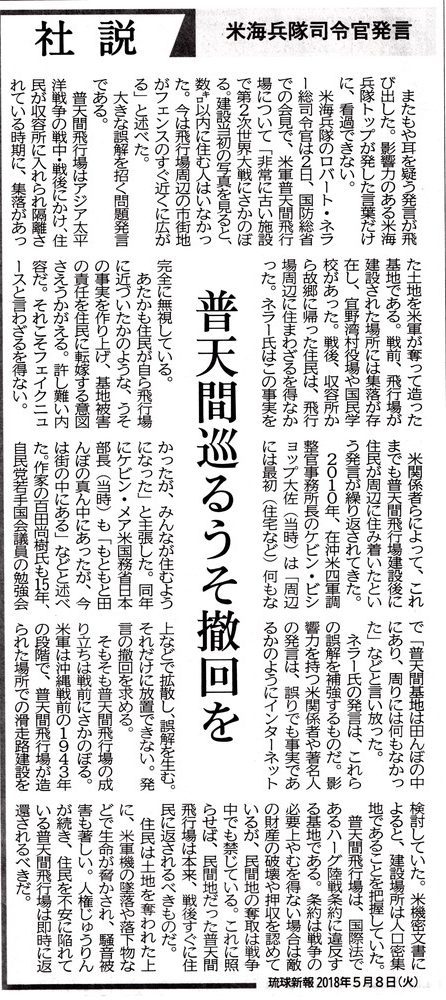 やっと戦争が終わったと思ったら帰るべき故郷を基地に奪われ、やむなく基地の周辺に住まざるを得なかった人々の、戦後70年余の苦悩を無視し、愚弄するあからさまなこれらの嘘を告発し、正さなければならない。