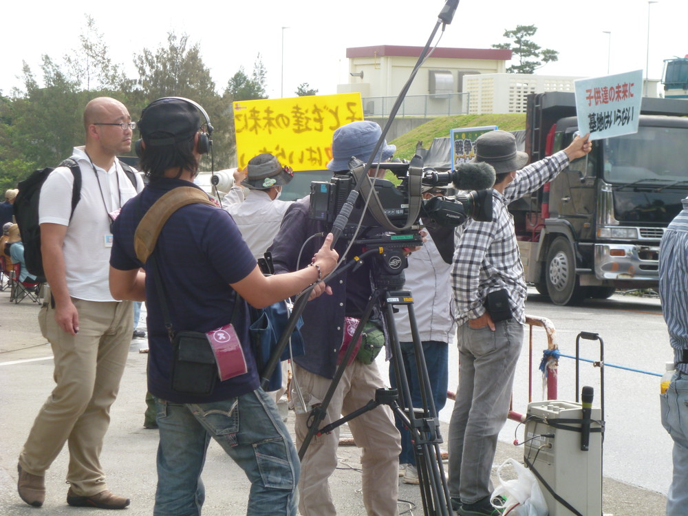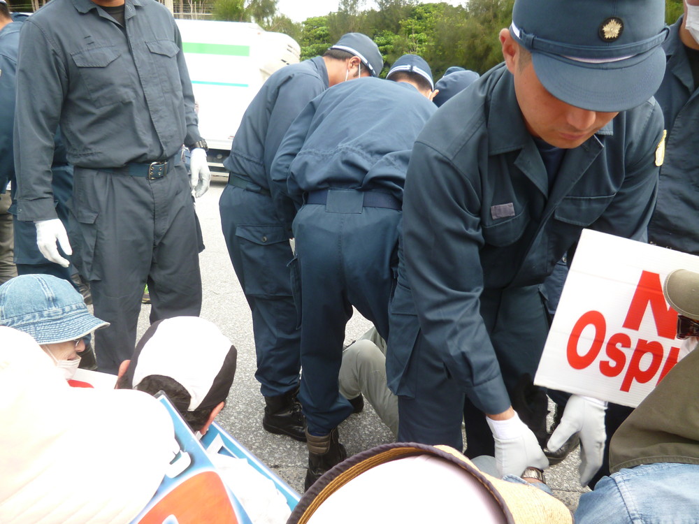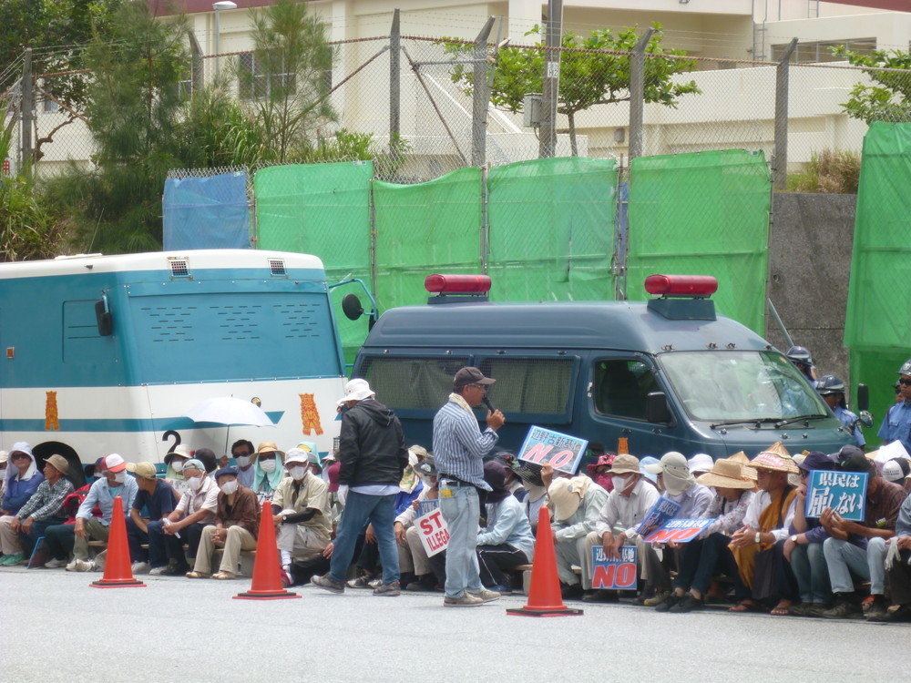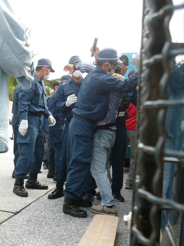 相変わらず無粋なのは県警機動隊。9時前、80人ほどが座り込んだが、ゴボウ抜きされ、150台近くのダンプやミキサー車が基地の中に入った。