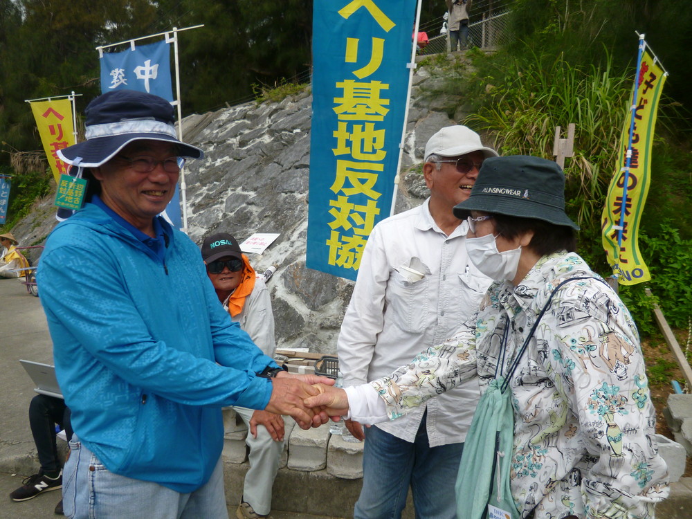 前名護市長の稲嶺進さん、一市民になっても頻繁にゲート前へ座り込みにいらっしゃる。この方の「陸にも、海にも基地は造らせない」は、単なる選挙目当ての政治的パフォーマンスではなかったことを身をもって示している。稀有な本物の政治家だ。多くの人が握手を求めて声をかけていた。