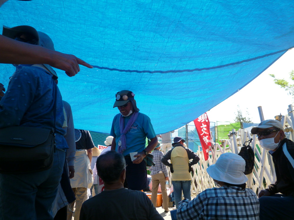 たまりかねて、檻の中で市民の側も対応策を取り、近くにあったブルーシートでにわかテントをしつらえて暑さを凌ぐ。