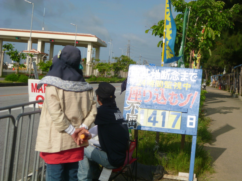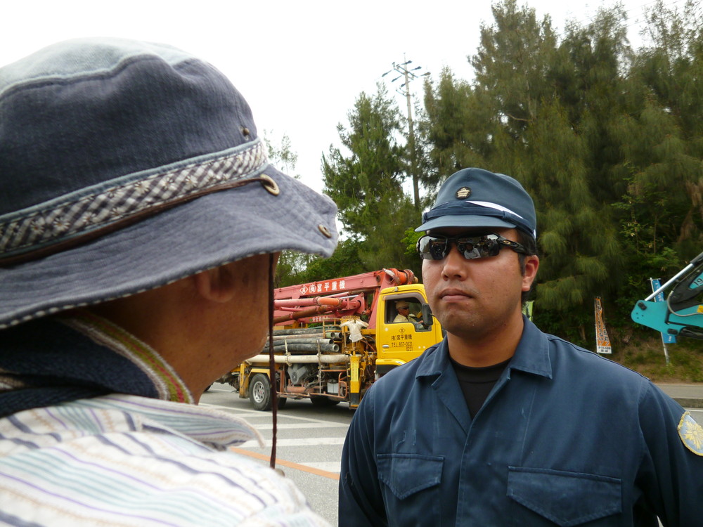座り込みを見下ろすように、基地の中で待機する警察車両が三台。警察と米軍(日本政府)の結託ぶりをうかがわせる。一方、町の中の交番は無人交番が目立つ。カウンターに電話機が一つぽつんと置いてあるだけで警察官の姿はない。「御用の方は電話してください」とあり、那覇署につながるようになっている。これでは緊急のとき、何の役にも立たない。米軍基地をまもるために、本来の警察の仕事はないがしろにされている。(余談だけど…)