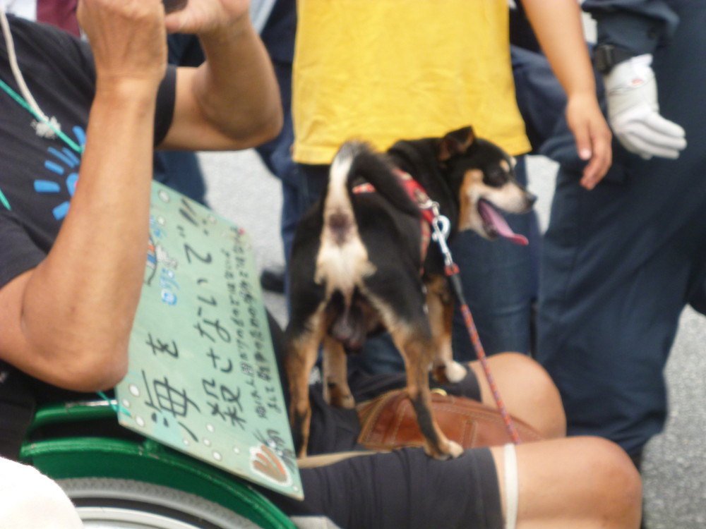 ご主人様の膝の上ながら、一匹のワンちゃんが「ワン!も新基地反対」と、機動隊と対峙して吠え続けた。ワンとは、沖縄のことばで「わたし」「我」の意。