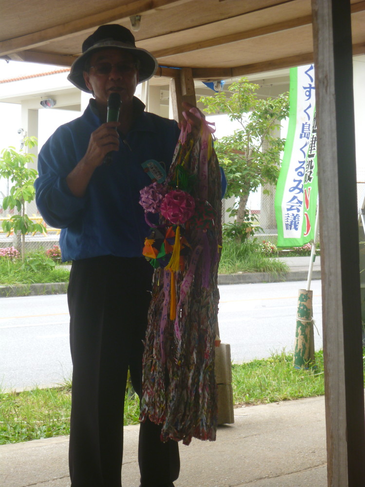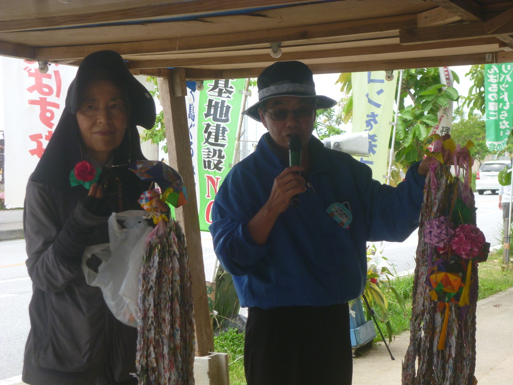 前名護市長の稲嶺進さんが、東京の集会で講演し、集まった人たちから千羽づるを預かってきたと報告。「沖縄は孤立していない。全国の支援を力にガンバロウ」と呼びかけた。