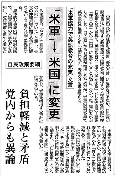 それを、こんどは「米軍ではあまりにも露骨だ」という自民党内部の批判から、中身はそのままに、言葉だけ「米軍」を「米国」に言い換えるというこざかしさ。どこまで県民を愚弄するのか!