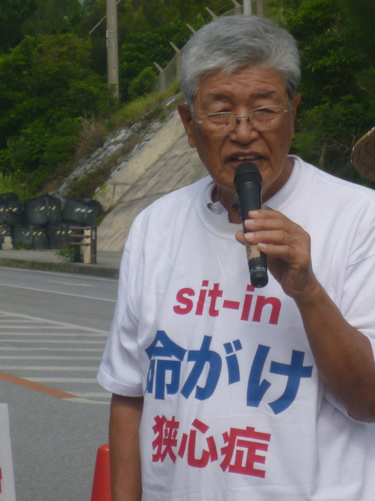 名護市議の大城敬人さん、3年前にこのゲート前で機動隊にごぼう抜きされ運ばれる途中に狭心症の発作を起こした。救急車で運ばれ一命をとりとめたが、杖なしで歩けるように回復するまでに1年以上かかったという。以来、このTシャツ着て心臓の病歴のあることを明示し、機動隊の強制排除の際は、いつも自ら立ち上がってこの場を離れるようにしている。