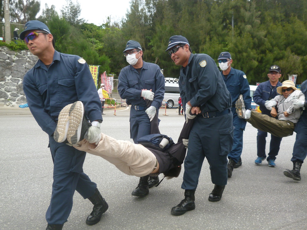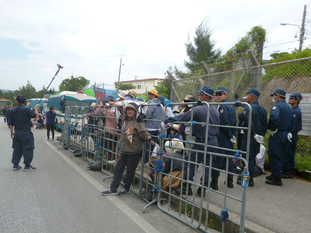 機動隊にも病気のことが認知されてきたため、最近はTシャツを着ていないことも多くなっていた。ところが昨日(12日)、病気のことを告げても、機動隊は大城さんを離さず、強引に担いで檻に運び込んだ。檻の中で気分が悪くなって解放を求めても、水を要求しても無視されたという。「周りにいた人たちと救護班の機転で事なきを得たが、まさに命がけで私たちはここに座っている」と憤った。