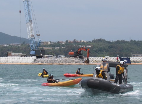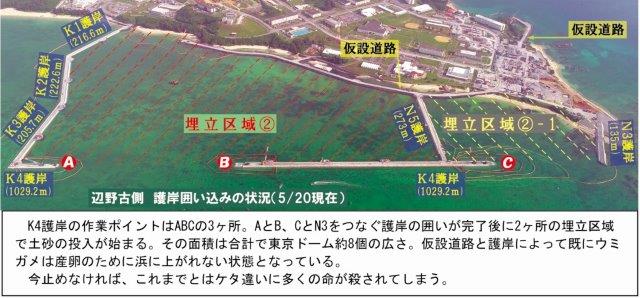 環境を守るための数々の対策をすべてすっ飛ばして護岸は完成したと見せかけ、土砂投入を急いでいる。(同じ国の工事で、那覇空港の拡張埋め立て工事では、これらの対策がすべて行われている)
