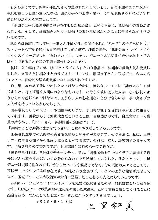 玉城デニーさんを推薦します ~ ある友人からの手紙 <辺野古座り込みテントにて~玉城デニーさん> 友人から友人へと、玉城デニーさんの人柄を伝えるこんな手紙が広がっています。 <車用 応援ステッカー> 沖縄~平和のメッセージ 2018年9月10日unaiリンクURL この記事を共有する → Tweet Pin It