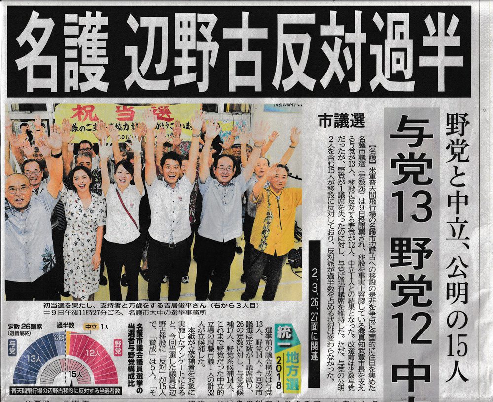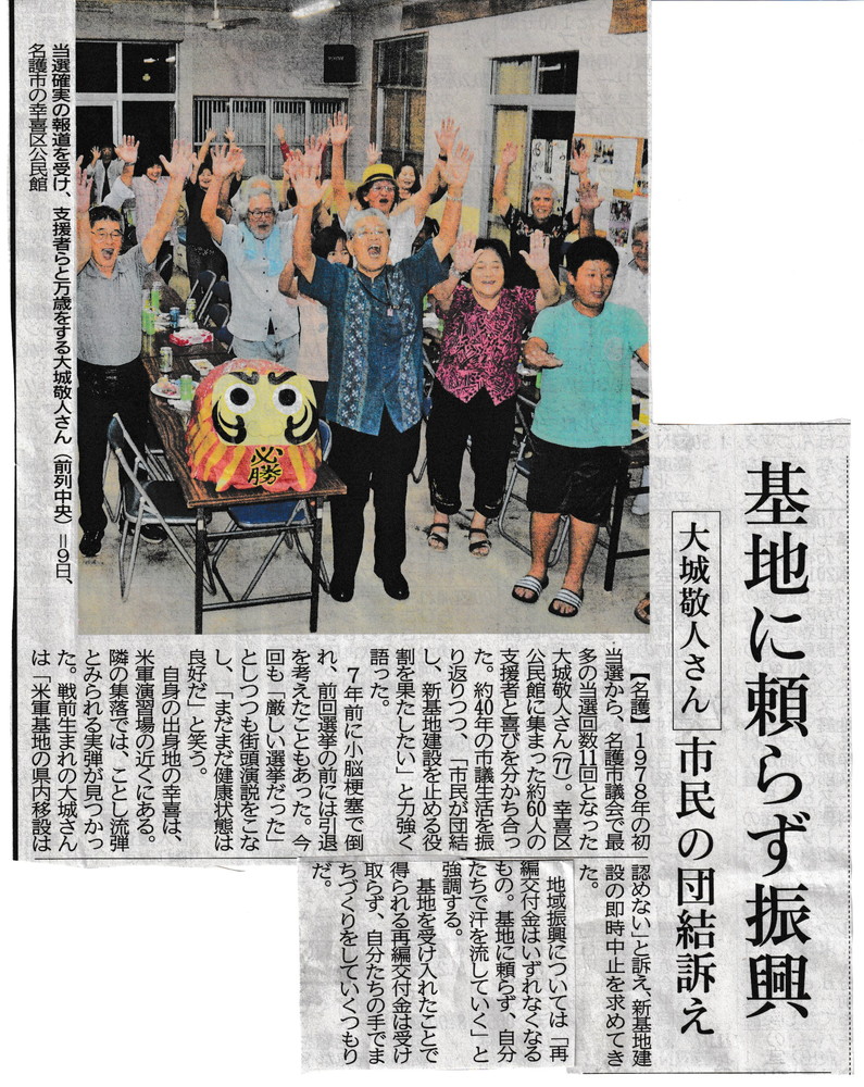 名護市議選~辺野古反対過半数維持 注目を集めた名護市会議員選挙は、辺野古に反対する議員が過半数を維持し、改めて根強い新基地反対への民意を示した。 <9月10日 琉球新報> 最古参で、20年余辺野古反対運動の先頭に立ってきた大城敬人さんも11期目の当選を果たした。 <9月10日 琉球新報> 地元新聞の記事より, 沖縄~平和のメッセージ 2018年9月11日unaiリンクURL この記事を共有する → Tweet Pin It