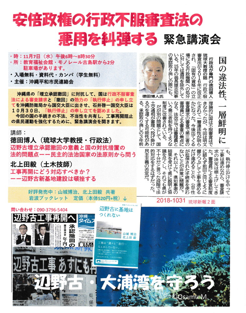 平和市民連絡会では、今回の防衛省による「行政不服審査法」適用の不当性を暴露し、工事再開を止めるために緊急講演会を、下記の通り開催する。ご参加を広く呼びかけます。