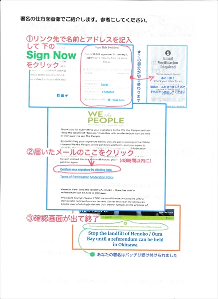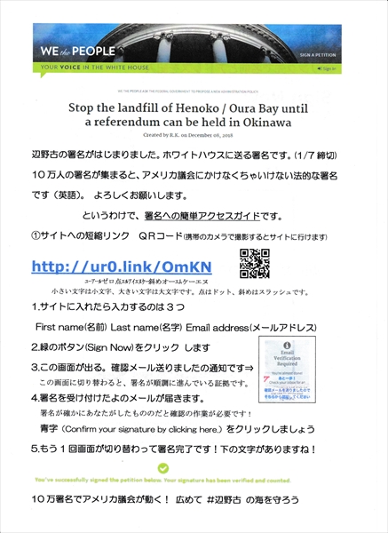 10万人署名でアメリカ議会が動く! ~ 改めてネット署名のお願い 13日にも呼びかけましたが、ある一定期間に10万人の署名が集まれば、米議会が優先案件として取り上げるというシステムを活用して、辺野古の新基地も建設を止めようという働きかけです。 辺野古で配られていたたチラシから「署名のやり方」をお伝えします。 沖縄~平和のメッセージ 2018年12月16日unaiリンクURL この記事を共有する → Tweet Pin It