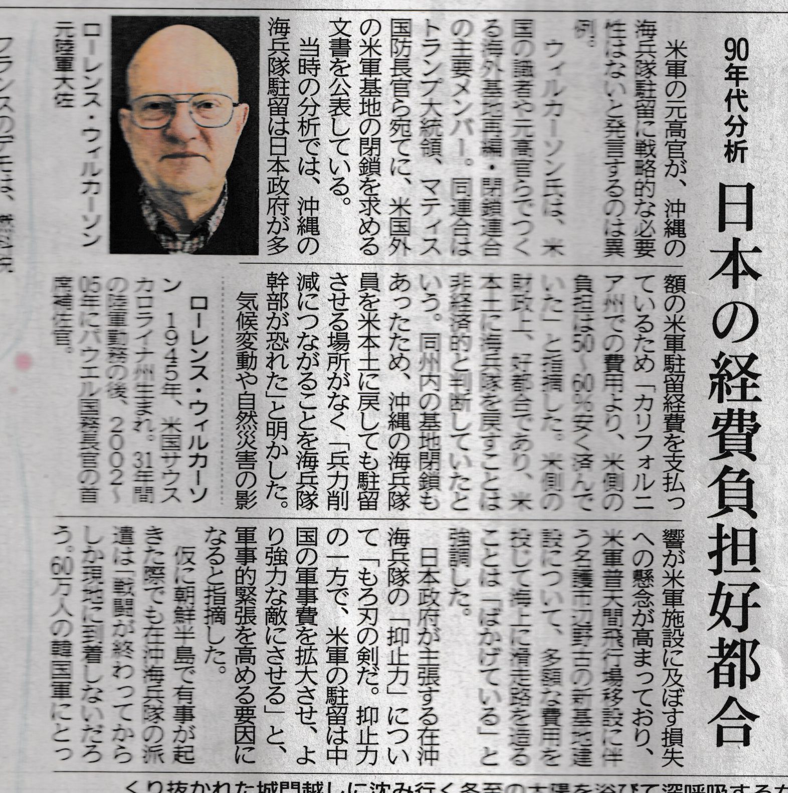 米軍の元高官が「日本が多額の駐留経費を負担する在沖海兵隊は、カリフォルニア州に置いておくより、50%~60%も安く済む。沖縄の海兵隊駐留に戦略的必要性はない」と語った。