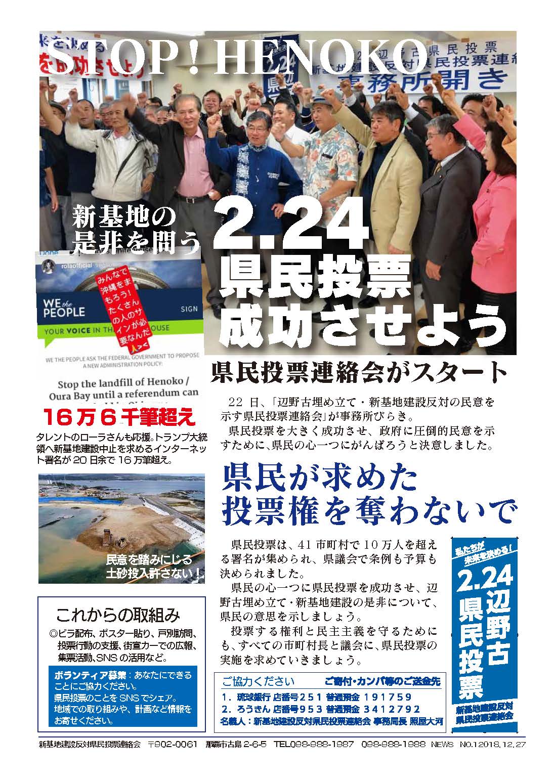 「新基地建設反対県民投票連絡会」からニュース第一号が届きました。
