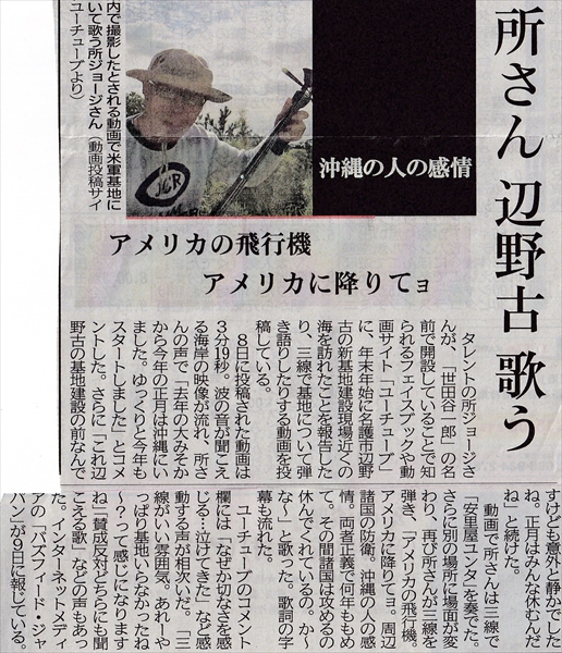 あの所ジョージさんが辺野古を歌う!! <琉球新報の1月10日の記事より> 県外のメディアには載らないと思うので…。 地元新聞の記事より, 沖縄~平和のメッセージ 2019年1月11日unaiリンクURL この記事を共有する → Tweet Pin It