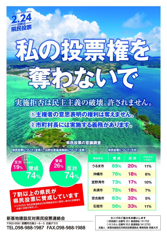 不参加を表明している5つの市は、県内2番目に人口の多い沖縄市を含め、合わせて31%に及ぶ県民が、県民投票に参加できないことになり、県民投票の結果に大きな影響を及ぼす。