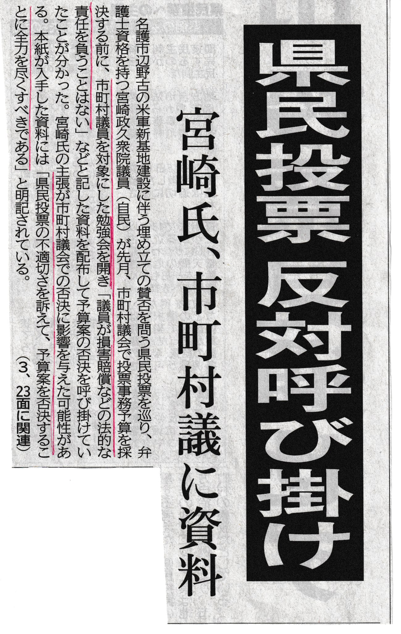 県民投票つぶしを指南 ~ 自民党衆議院議員が やっぱりね!しかし、ここまであからさまにやられると、もう言葉を発する気力も萎える。違法、無法は日常茶飯事、憲法違反も大手を振ってまかり通る。残念ながらこれが私たちの国の現実である。が…例え蟷螂の斧でも、言うべきことは言い、やるべきことはやる、しかない。 <琉球新報 1月14日朝刊より↑> 地元新聞の記事より, 沖縄~平和のメッセージ 2019年1月15日unaiリンクURL この記事を共有する → Tweet Pin It