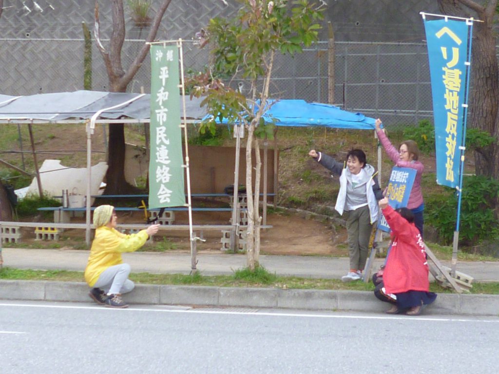 県外から参加の女性三人組、座り込みを前に「頑張るぞ!」と気合を入れて記念撮影。