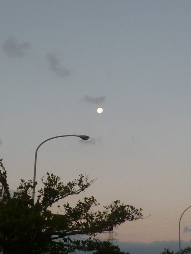 6:30に那覇を出発するときは、満月の名残をたたえた大きなお月様が、西の空でほほ笑んでいた。