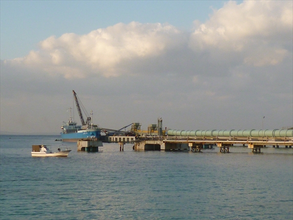 トラックが桟橋まで運んできた赤土は、沖合の土砂運搬船(台船)までベルトコンベアーでスルスルと積み込まれる。
