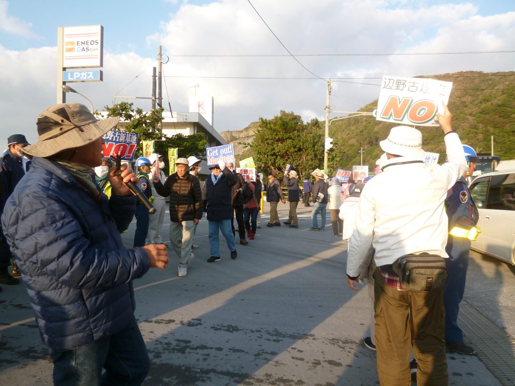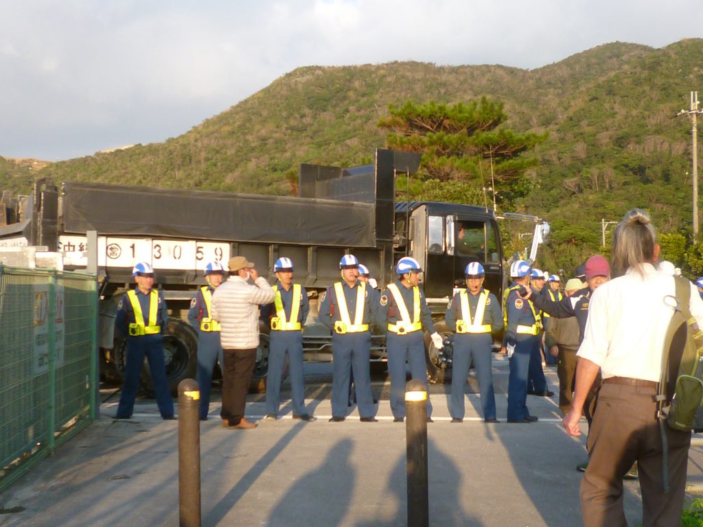安和では、辺野古のようにゲートに座り込むのではなく、山城博治さんの指揮のもと、機動隊に介入の口実を与えないために、ゲート前の歩道をひたすらゆっくり行ったり来たり歩き続けることで、土砂を積んだトラックの侵入を遅らせるという順法戦術がとられている。