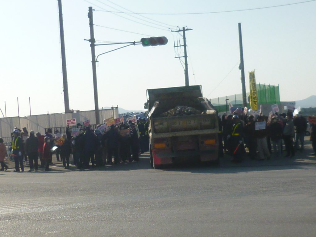 しかも、歩行者である私たちが青信号に従って直進車両と同時にゆっくりとゲート前を横切っているので、ますます右折しにくくなる。結局、横断している私たちを、機動隊が押しのけるようにして、トラックを通すのだが、一回の信号で右折できるのはせいぜい1台か2台。通常の半分以下になるのだという。